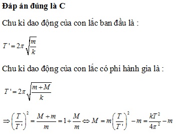 Ngoài không gian vũ trụ nơi không có trọng lượng để theo dõi sức khỏe của phi hành gia bằng cách đo khối lượng M của phi hành gia, người ta làm như sau: Cho phi hành gia ngồi cố định vào chiếc ghế có khối lượng m được gắn vào lo xo có độ cứng k thì thấy ghế dao động với chu kì T. Hãy tìm biểu thức xác định khối lượng M của phi hành gia: