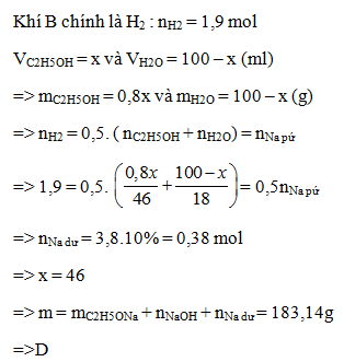 Cho Na được lấy dư 10% so với lượng cần thiết vào 100 ml ancol etylic x0 , khi phản ứng thu được 42,56 lit khí B ( ở điều kiện tiêu chuẩn) và m gam chất rắn. Biết khối lượng riêng của ancol etylic nguyên chất là 0,8g/ml ; của nước là 1g/ ml. Giá trị của m là: