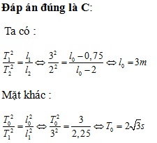 Một con lắc đơn có chiều dài là l dao động điều hòa với chu kì T. Nếu cắt bớt chiều dài đây treo một đoạn l1= 0,75m thì chu kì dao động bây giờ là T1= 3s, nếu cắt tiếp dây treo một đoạn nữa là l2 = 1,25m thì chu kì dao động bây giờ là T2 = 2s. Chiều dài l của con lắc ban đầu và chu kì T của nó là: