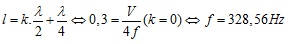 Để đo vận tốc truyền âm trong không khí người ta dùng một thoa đặt ở khe thổi của một ống sáo dọc và bịt tất cả các lỗ nối âm của ống sáo. Khoảng cách từ khe thổi đến đầu hở của ống sáo là 30cm. Cho tần số âm thoa tăng đều từ 0HZ thì tần số âm thoa là 273,8 Hz người ta nhận thất âm phát ra có cường độ mạnh nhất. tính vận tốc truyền âm của không khí