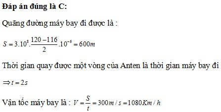Một ăng ten ra đa phát ra những sóng điện từ đến một máy bay đang bay về phía ra đa. Thời gian từ lúc ăng ten phát điện đến khi nhận sóng phản xạ trở lại là 120 µs, ăng ten quay với tốc độ 0,5 vòng/s. Ở vị trí đầu của vòng quay tiếp theo ứng với hưởng của máy bay, ăng ten lại phát sóng điện từ, thời gian từ lúc phát sóng đến lúc nhận lần này là116 µs. Tính vận tốc trung bình của máy bay, biết tốc độ truyền sóng điện từ trong không khí bằng 3.108 (m/s)