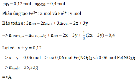 Cho 6,72g Fe phản ứng với 125 ml dung dịch HNO3 3,2M , thu được dung dịch X và khí NO ( sản phẩm khử duy nhất của N+5). Biết các phản ứng xảy ra hoàn toàn , khối lượng muối trong dung dịch X là :