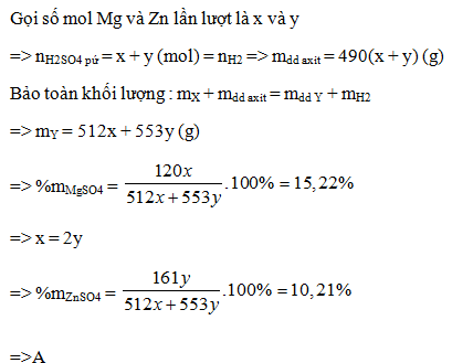Hòa tan hoàn toàn hỗn hợp X gồm Mg và Zn bằng một lượng vừa đủ dung dịch H2SO4 20% loãng thu được dung dịch Y. Nồng độ của MgSO4 trong dung dịch Y là 15,22%. Nồng độ % của ZnSO4 trong dung dịch Y là :