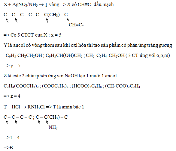 Hidrocacbon C6H10 (X) có x đồng phân tác dụng với dung dịch AgNO3 /NH3 tạo kết tủa vàng nhạt, ancol thơm C8H10O(Y) có y đồng phân oxi hóa thu được sản phẩm tham gia được phản ứng tráng gương, este hai chức có mạch cacbon không phân nhánh C6H10O4 (Z) có z đồng phân tác dụng với dung dịch NaOH tạo ra một muối một ancol, amin C4H11N (T) có t đồng phân tác dụng với dung dịch HCl tạo ra muối dạng RNH3Cl (R là gốc hidrocacbon). Mối liên hệ đúng giữa x, y, z, t là :