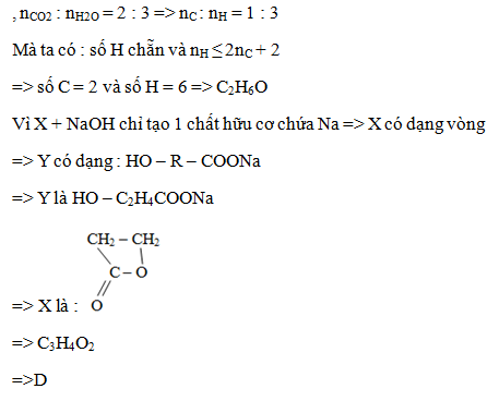 Xà phòng hóa este X đơn chức, no chỉ thu được một chất hữu cơ Y chứa Na. Cô cạn, sau đó thêm NaOH/CaO rồi nung nóng thu được một ancol Z và một muối vô cơ. Đốt cháy hoàn toàn ancol này thu được CO2 và hơi nước theo tỉ lệ thể tích là 2 : 3. Công thức phân tử este X là :