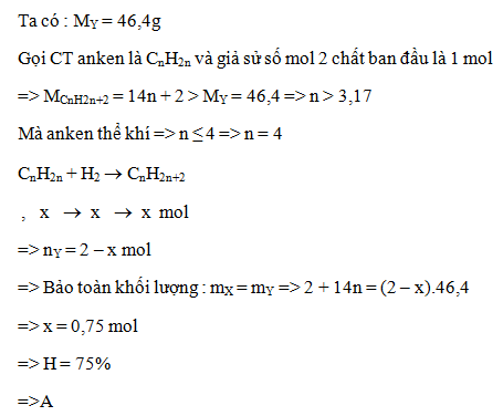 Hỗn hợp X gồm H2 và một anken (là chất khí ở điều kiện thường) có số mol bằng nhau. Dẫn X qua Ni nung nóng, thu được hỗn hợp Y có tỉ khối so với He bằng 11,6. Hiệu suất của phản ứng hiđro hóa là