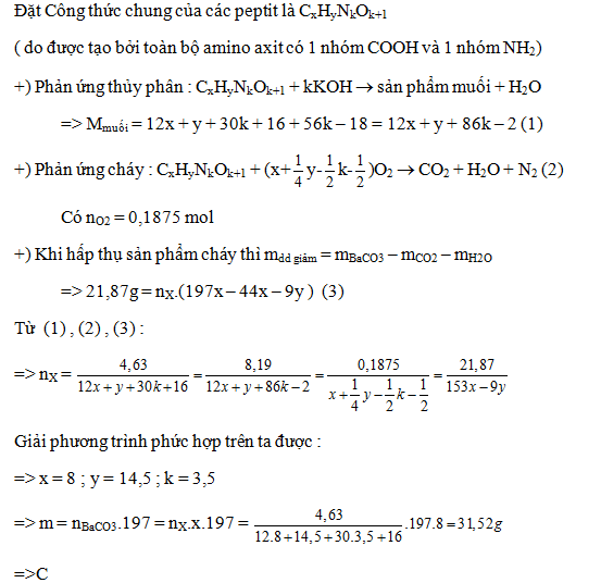 Đun nóng 4,63 gam hỗn hợp X gồm ba peptit mạch hở với dung dịch KOH (vừa đủ). Khi các phản ứng kết thúc, cô cạn dung dịch thu được 8,19 gam muối khan của các amino axit đều có dạng H2NCmHnCOOH. Đốt cháy hoàn toàn 4,63 gam X cần 4,2 lít O2 (đktc), hấp thụ hết sản phẩm cháy (CO2, H2O, N2) vào dung dịch Ba(OH)2 dư. Sau phản ứng thu được m gam kết tủa và khối lượng phần dung dịch giảm bớt 21,87 gam. Giá trị của m gần giá trị nào nhất sau đây?