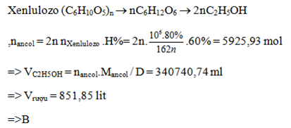 Thủy phân hết một tấn mùn cưa chứa 80% xenlulozo rồi cho lên men rượu với hiệu suất 60%. Biết khối lượng riêng của C2H5OH nguyên chất là 0,8g/ml.Thể tích rượu 400 thu được là
