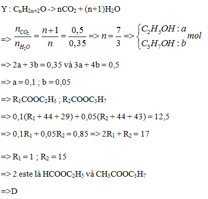 Một hỗn hợp X gồm 2 este đơn chức E,F (ME < MF). Đun nóng 12,5g hỗn hợp X với một lượng dung dịch NaOH vừa đủ thu được 7,62g hỗn hợp ancol no Y đơn chức có khối lượng phân tử hơn kém nhau 14dvC và hỗn hợp 2 muối Z. Đốt cháy 7,6g Y thu được 7,84 lit khí CO2 (dktc) và 9,0g H2O. Công thức của E là :
