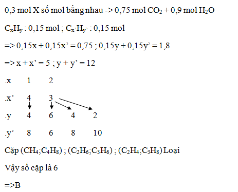 Đốt cháy hoàn toàn 0,3 mol hỗn hợp X gồm 2 hidrocacbon có số mol bằng nhau thu được 0,75 mol CO2 và 0,9 mol H2O. Số cặp công thức cấu tạo thỏa mãn X là :