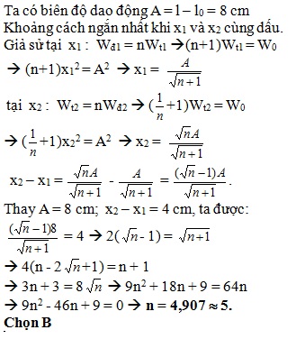 Một con lắc lò xo gồm lò xo có chiều dài tự nhiên l0 = 30 cm. Kích thích cho con lắc dao động điều hòa theo phương nằm ngang thì chiều dài cực đại của lò xo là 38 cm. Khoảng cách ngắn nhất giữa hai thời điểm động năng bằng n lần thế năng và thế năng bằng n lần động năng là 4 cm. Giá trị lớn nhất của n gần với giá trị nào nhất sau đây ?