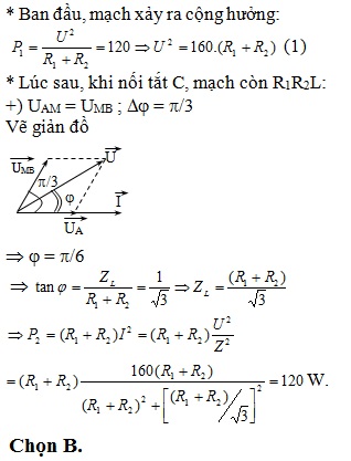 Một đoạn mạch AB gồm hai đoạn mạch AM và MB mắc nối tiếp. Đoạn mạch AM gồm điện trở thuần R1 mắc nối tiếp với tụ điện có điện dung C, đoạn mạch MB gồm điện trở thuần R2 mắc nối tiếp với cuộn cảm thuần có độ tự cảm L. Đặt điện áp xoay chiều có tần số và giá trị hiệu dụng không đổi vào hai đầu đoạn mạch AB. Khi đó đoạn mạch AB tiêu thụ công suất bằng 160 W và có hệ số công suất bằng 1. Nếu nối tắt hai đầu tụ điện thì điện áp hai đầu đoạn mạch AM và MB có cùng giá trị hiệu dụng nhưng lệch pha nhau