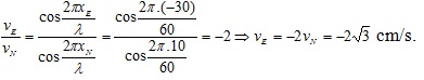 sóng dừng trên sợi dây đàn hồi dài với bước sóng 60 cm. Ba điểm theo đúng thứ tự E, M và N trên dây ( EM = 3MN = 30 cm) và M là điểm bụng. Khi vận tốc dao động tại N là