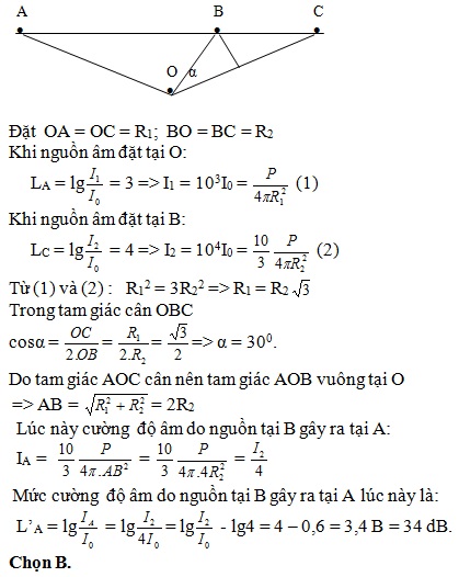 Trong môi trường đẳng hướng và không hấp thụ âm, có ba điểm theo thứ tự A, B và C thẳng hàng. Một nguồn điểm phát âm có công suất là P đặt tại O sao cho mức cường độ âm tại A và tại C bằng nhau và bằng 30 dB. Bỏ nguồn âm tại O, đặt tại B một nguồn âm điểm phát âm có công suất