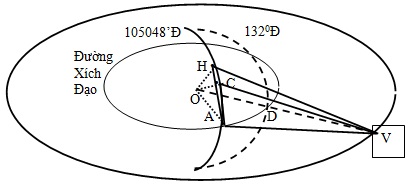 Vệ tinh viễn thông địa tĩnh Vinasat-1 của Việt Nam nằm trên quỹ đạo địa tĩnh (là quỹ đạo tròn ngay phía trên xích đạo Trái Đất (vĩ độ 00 ), ở cách bề mặt Trái Đất 35000 km và có kinh độ 1320Đ. Một sóng vô tuyến phát từ Đài truyền hình Hà Nội ở tọa độ (210 01’B, 1050 48’Đ) truyền lên vệ tinh, rồi tức thì truyền đến Đài truyền hình Cần Thơ ở tọa độ (100 01’B, 1050 48’Đ). Cho bán kính Trái Đất là 6400 km và tốc độ truyền sóng trung bình là