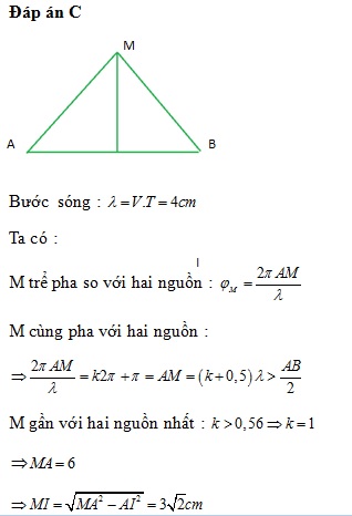cm dao động theo phương trình u = Acos20πt (mm) . Biết tốc độ truyền sóng trên mặt nước là 0,4m/s và biên độ sóng không đổi trong quá trình truyền . Điểm gần nhất ngược pha với các nguồn nằm trên đường trung trực của S1S2 cách S1S2 một đoạn bằng