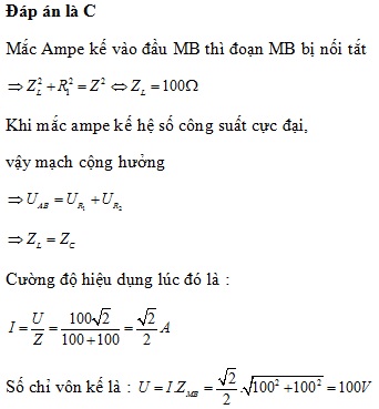 Cho đoạn mạch AB mắc nối tiếp lần lượt gồm : cuộn dây thuần cảm L , điện trở thuần R1= 100Ω, tụ điện có điện dung C và điện trở thuần R2 =R1 .Gọi M là điểm nối giữa R1 và tụ điện C . Điện áp giữa hai đầu đoạn mạch là uAB =200cosɷt (V) . Khi mắc ampe kế ( có RA =0 ) vào hai đầu đoạn mạch MB thì ampe kế chỉ 1 (A) . Khi bỏ ampe kế ra và mắc vào hai đầu MB một vôn kế (RV rất lớn ) thì hệ số công suất của đoạn mạch AB cực đại .Số chỉ vôn kế là