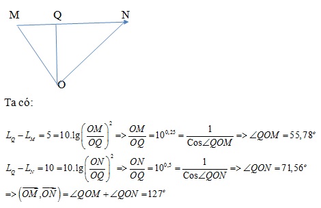Tại vị trí O trên mặt đất, người ta đặt một nguồn phát âm với công suất không đổi. Một thiết bị xác định mức cường độ âm chuyển động từ M đến N. mức cường độ âm của âm phát ra O do máy thu được trong quá trình chuyển động từ 45dB đến 50dB rồi giảm về 40dB. Các phương OM và ON hợp với nhau một góc vào khoảng: