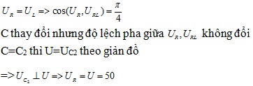 Đặt một điện áp xoay chiều vào hai đầu đoạn mạch gồm điện trở thuần R, cuộn cảm L, tụ điện có điện dung thay đổi được C. Khi C = , điện áp hiệu dụng trên các phần tử lần lượt là UR = 40V, UL = 40V, UC = 70V. Khi C = , điện áp hiệu dụng giữa hai đầu tụ điện là 50V, điện áp hiệu dụng giữa hai đầu điện trở là: