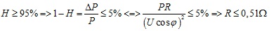 Ta cần truyền một công suất 200MW đến nơi tiêu thụ bằng mạch điện một pha, hiệu điện thế hiệu dụng hai đầu nguồn cần truyền tải là50kV. Mạch điện truyền tải có hệ số công suất cos φ = 0,9. Muốn cho hiệu suất truyền tải điện H ≥ 95% thì điện trở của đường dây tải điện phải có gíá trị: