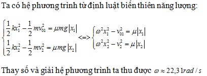 Một con lắc lò xo có một đầu được gắn cố định, đầu kia gắn với vật nhỏ. Vật chuyển động có ma sát trên mặt phẳng nằm ngang dọc theo trục lò xo. Nếu đưa vật tới vị trí lò xo bị nén 10cm rồi thả ra thì khi qua vị trí lò xo không biến dạng đầu tiên, vật có vận tốc 2m/s. Nếu đưa vật tới vị trí lò xo bị nén 8cm rồi thả ra thì khi qua vị trí lò xo không biến dạng đầu tiên, vật có vận tốc 1,55m/s. Tần số góc của con lắc có độ lớn gần nhất với giá trị nào sau đây: