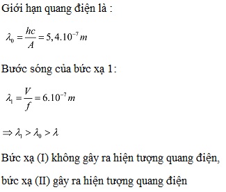 Công thoát của electron khỏi một kim loại là 3,68. 10-19J, khi chiếu vào một tấm kim loại đó lần lượt hai bức xạ (I) có tần số 5. 1014 Hz và bức xạ (II) có bước sóng 0,25 µm thì