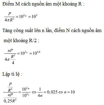 Nguồn âm điểm O phát sóng đẳng hướng ra môi trường không hấp thụ và không phản xạ. Điểm M cách nguồn âm một khoảng R có mức cường độ âm 20dB. Tăng công suất nguồn âm lên n lần thì mức cường độ âm tại N cách nguồn âm một khoảng R/2 là 36dB. Giá trị của n là