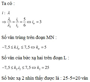 Trong thí nghiệm Y – âng về giao thoa ánh sáng, nguồn sáng phát ra đồng thời hai bức xạ có bước sóng lần lượt là λ1 = 0,5 µm, và λ2 = 0,6 µm. Biết hai khe I – âng cách nhau 1mm và khoảng cách từ hai khe đến màn ảnh là 1m. Kích thước vùng giao thoa MN trên màn là 15mm, đối xứng qua vân sáng trung tâm. Số vân sáng trên màn có màu của λ2 quan sát được trong khoảng MN là