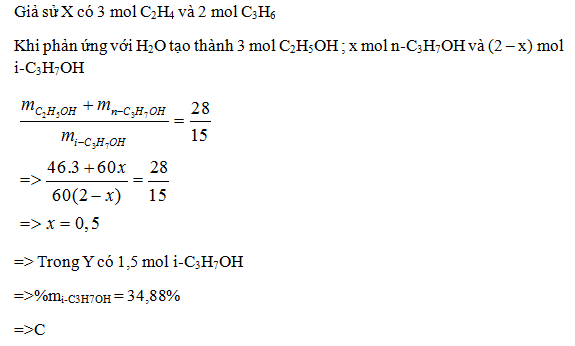 Hỗn hợp X gồm etilen và propilen với tỷ lệ thể tích tương ứng 3 : 2. Hidrat hóa hoàn toàn 1 thể tích X thu được hỗn hợp ancol Y trong đó tỷ lệ về khối lượng các ancol bậc 1 so với bậc 2 là 28 : 15. Thánh phần phân trăm về khối lượng của các ancol iso-propylic trong Y là :
