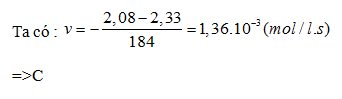 Xét phân hủy N2O5 trong dung môi CCl4 ở 45oC: N2O5→N2O4 + 1/2O2. Ban đầu nồng độ của N2O5 là 2,33M, sau 184 giây nồng độ của N2O5 là 2,08M. Tốc độ trung bình của phản ứng tính theo N2O5 là: