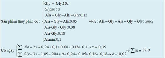 Thủy phân hết m gam pentapeptit X (mạch hở) thu được hỗn hợp gồm 32,88 gam Ala-Gly-Ala-Gly; 10,85 gam Ala-Gly-Ala; 16,24 gam Ala-Gly-Gly; 26,28 gam Ala-Gly; 8,9 gam Ala và a gam hỗn hợp gồm Gly-Gly và Gly, trong đó tỉ lệ mol Gly-Gly và Gly là 10 : 1. Giá trị của a là