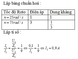 Một máy phát điện xoay chiều có điện trở trong không đáng kể. Mạch ngoài là tụ điên nối tiếp với ampe kế nhiệt có điên trở nhỏ. Khi roto quay với tốc độ góc 25rad/s thì ampe kế chỉ 0,1A. Khi roto quay với tốc độ góc 25rad/s thì ampe kế chỉ: