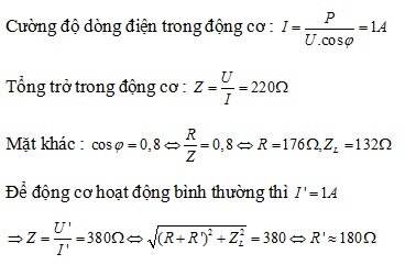 Một dòng điện có ghi 220 – 176W, hệ số công suất bằng 0,8 được mắc vào mạch điện xoay chiều có điện áp hiệu dụng 380V. Đế động cơ hoạt động bình thường, phải mắc động cơ nối tiếp một điện trở thuàn có giá trị là