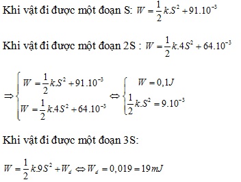 Một chất điểm đang dao động điều hòa với biên độ A theo phương ngang, khi vừa đi qua khỏi VTCB một đoạn S thì động năng của chất điểm là 91 mJ. Đi tiếp một đoạn S thì động năng chỉ còn 64 mJ. Nếu đi tiếp một đoạn S nữa (biết A > 3S) thì động năng là: