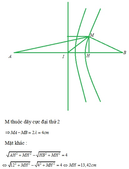 Trong thí nghiệm giao thoa trên mặt nước, hai nguồn kết hợp A và B cách nhau 16cm dao động với tần số f = 15Hz và cùng pha. Tốc độ truyền sóng trên mặt nước là 30cm/s. Một điểm M trên mặt nước thuộc cực đại thứ 2 cách trung trực của AB đoạn 4cm thì M cách AB đoạn xấp xỉ bằng: