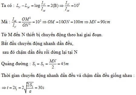 Tại vị trí O trong một nhà máy, một còi báo cháy (xem là nguồn điểm) phát âm với công suất không đổi. Từ bên ngoài một thiết bị xác định mức cường độ âm chuyển động thẳng theo hướng MO đi từ M đến N theo hai giai đoạn với vận tốc ban đầu bằng 0 và gia tốc có độ lớn 0,2m/s2 cho đến khi dừng lại tại N (cổng nhà máy). Biết NO = 10m và mức cường độ âm (do còi phát ra) tại N lớn hơn mức cường độ âm tại M là 20dB. Cho rằng môi trường truyền âm là đẳng hướng và không hấp thụ âm. Thời gian thiết bị đó chuyển động từ M đến N có giá trị gần giá trị nào nhất sau đây?