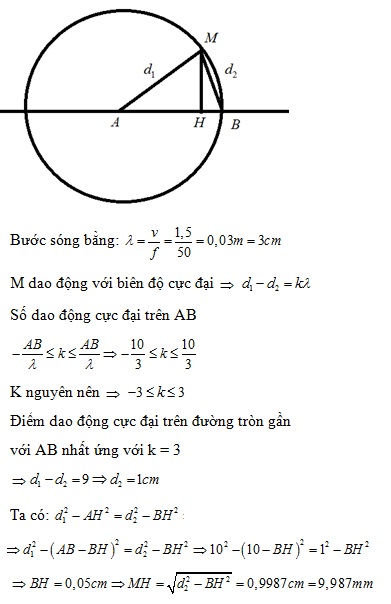 Giao thoa sóng nước với hai nguồn giống hệt nhau A, B cách nhau 10cm có tần số 50Hz. Tốc độ truyền sóng trên mặt nước là 1,5m/s. Trên mặt nước xét đường tròn tâm A, bán kính AB. Điểm trên đường tròn dao động với biên độ cực đại cách đường thẳng qua A, B một đoạn gần nhất là