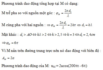 Hai nguồn S1, S2 cách nhau 4cm, phát ra hai sóng có phương trình u1 = u2 = acos200πt. Sóng sinh ra truyền với tốc độ 0,8 m/s. Điểm M trên mặt chất lỏng cách đều và dao động cùng pha với S1, S2 và gần S1S2 nhất có phương trình là