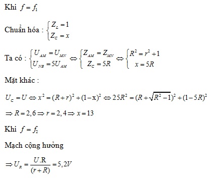 (f thay đổi được) vào hai đầu đoạn mạch AB gồm ba phần tử mắc nối tiếp theo thứ tự: điện trở thuần R; cuộn dây có điện trở và tụ điện. Gọi M là điểm nối giữa R và cuộn dây; N là điểm nối giữa cuộn dây và tụ điện. Khi f = f1 thì UAM = UMN = 2V; UNB = 10V. Khi f = f2 trong mạch có hiện tượng cộng hưởng điện áp hiệu dụng giữa hai đầu điện trở thuần gần giá trị nào nhất sau đây: