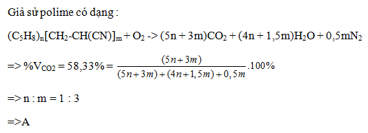 Khi đốt một lượng polime sinh ra từ phản ứng đồng trùng hợp isoprene với acrilonitrin bằng O2 vừa đủ, tạo thành hỗn hợp khí chứa 58,33% CO2 về thể tích. Tỉ lệ số mắt xích acrilonitrin và isopren trong polime đó tương ứng là: