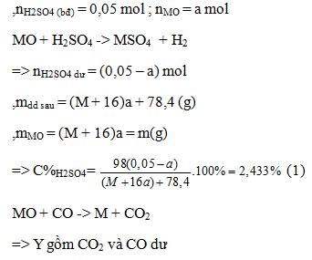 Hòa tan hoàn toàn m gam oxit MO (M là kim loại) trong 78,4 gam dung dịch H2SO4 6,25% (loãng) thì thu được dung dịch X trong đó nồng độ H2SO4 còn dư là 2,433%. Mặt khác, khi cho CO dư đi qua m gam MO nung nóng, sau khi phản ứng xảy ra hoàn toàn thu được hỗn hợp khí Y. Cho Y qua 500 ml dung dịch NaOH 0,1M thì chỉ còn một khí duy nhất thoát ra, trong dung dịch thu được có chứa 2,96 gam muối. Kim loại M là: (Fe=56, Cu=64, Cr=52, Ni=59, Na=23, S=32, O=16)