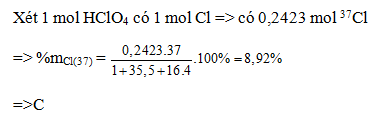 Trong tự nhiên đồng vị 37Cl chiếm 24,23% số nguyên tử clo. Nguyên tử khối trung bình của clo bằng 35,5. Thành phần phần trăm về khối lượng của 37Cl có trong HClO4 là (với 1H, 16O):