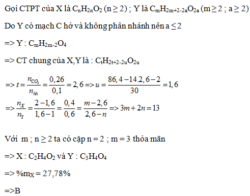 Hóa hơi 8,64 gam hỗn hợp gồm một axit no, đơn chức, mạch hở X và một axit no, đa chức Y (có mạch cacbon hở, không phân nhánh) thu được một thể tích hơi bằng thể tích của 2,8 gam N2 (đo trong cùng điều kiện). Đốt cháy 8,64 gam hỗn hợp axit trên thu được 11,44 gam CO2. Phần trăm khối lượng của X trong hỗn hợp ban đầu là :