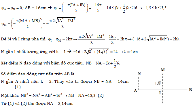 Tại hai điểm A và B trên mặt nước cách nhau 16(cm) có hai nguồn kết hợp dao động điều hòa cùng tần số, cùng pha nhau. Điểm M trên mặt nước và nằm trên đường trung trực của AB cách trung điểm I của AB một khoảng nhỏ nhất bằng