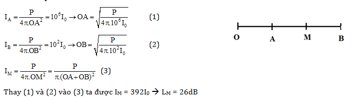Ba điểm O, A, B cùng nằm trên một nửa đường thẳng xuất phát từ O. Tại O đặt một nguồn điểm phát sóng âm đẳng hướng ra không gian, môi trường không hấp thụ âm. Mức cường độ âm tại A là 60 dB, tại B là 20 dB. Mức cường độ âm tại trung điểm M của đoạn AB là: