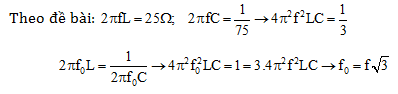 Đoạn mạch điện xoay chiều RLC nối tiếp, có cuộn dây thuần cảm: Khi tần số của dòng điện là f thì cảm kháng bằng 25Ω, và dung kháng bằng 75 Ω. Khi tần số của dòng điện là f0 thì dung kháng và cảm kháng bằng nhau. Biểu thức liên hệ giữa f và f0 là: