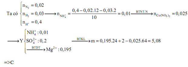 Hòa tan m gam Mg trong 500 ml dung dịch chứa hỗn hợp H2SO4 0,4M và Cu(NO3)2 đến phản ứng hoàn toàn thu được 1,12 lít hỗn hợp khí X (đktc) có tỉ khối của X so với H2 là 6,2 gồm N2 và H2, dung dịch Y và 2 gam hỗn hợp kim loại. Giá trị m là ?