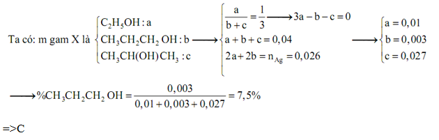 Hidrat hóa hỗn hợp etilen và propilen có tỉ lệ mol 1 : 3 khi có mặt axit H2SO4 loãng thu được hỗn hợp ancol X. Lấy m gam hỗn hợp ancol X cho tác dụng hết với Na thấy bay ra 448 ml khí (đktc). Oxi hóa m gam hỗn hợp ancol X bằng O2 không khí ở nhiệt độ cao và có Cu xúc tác được hỗn hợp sản phẩm Y. Cho Y tác dụng với AgNO3 trong NH3 dư thu được 2,808 gam bạc kim loại. Phần trăm số mol propan – 1 – ol trong hỗn hợp là ?