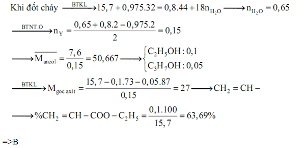 Một hỗn hợp Y gồm 2 este A, B (MA < MB). Nếu đun nóng 15,7 gam hỗn hợp Y với dung dịch NaOH dư thì thu được một muối của axit hữu cơ đơn chức và 7,6 gam hỗn hợp hai ancol no đơn chức kế tiếp nhau trong dãy đồng đẳng. Nếu đốt cháy 15,7 gam hỗn hợp Y cần dùng vừa hết 21,84 lít O2 (đktc), thu được 17,92 lít CO2 (đktc). Thành phần % khối lượng của A trong hỗn hợp Y là ?