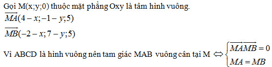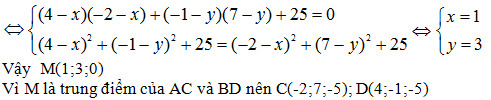 Trong không gian với hệ tọa độ Oxyz, cho hình vuông ABCD có điểmA(4;-1;5) và điểm B(-2;7;5). Tìm tọa độ điểm C, D biết tâm hình vuông thuộc mp(Oxy).